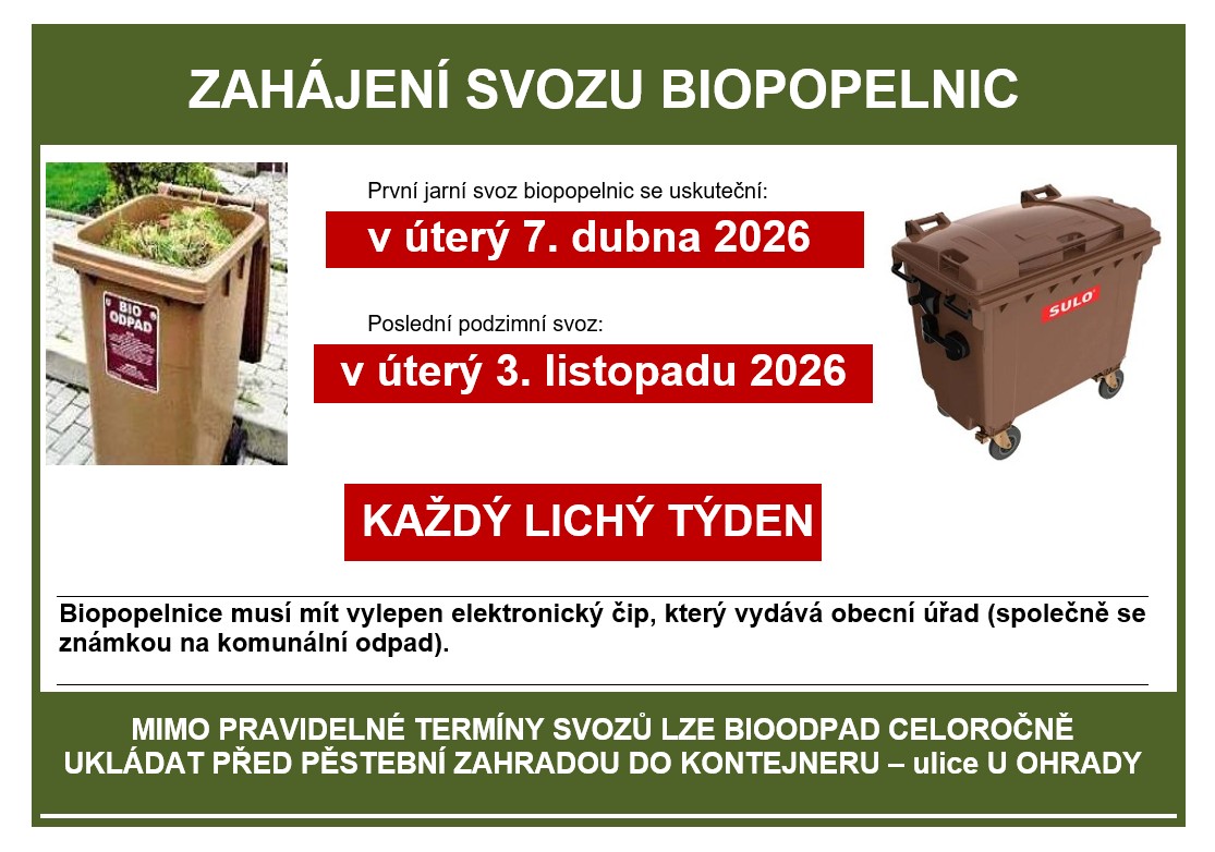 První jarní svoz se uskuteční v úterý 7. dubna 2026. Poslední podzimní svoz se uskuteční v úterý 3. listopadu 2026. Po tomto datu nádoby odkliďte ze svozového místa. Biokontejnery budou staženy.